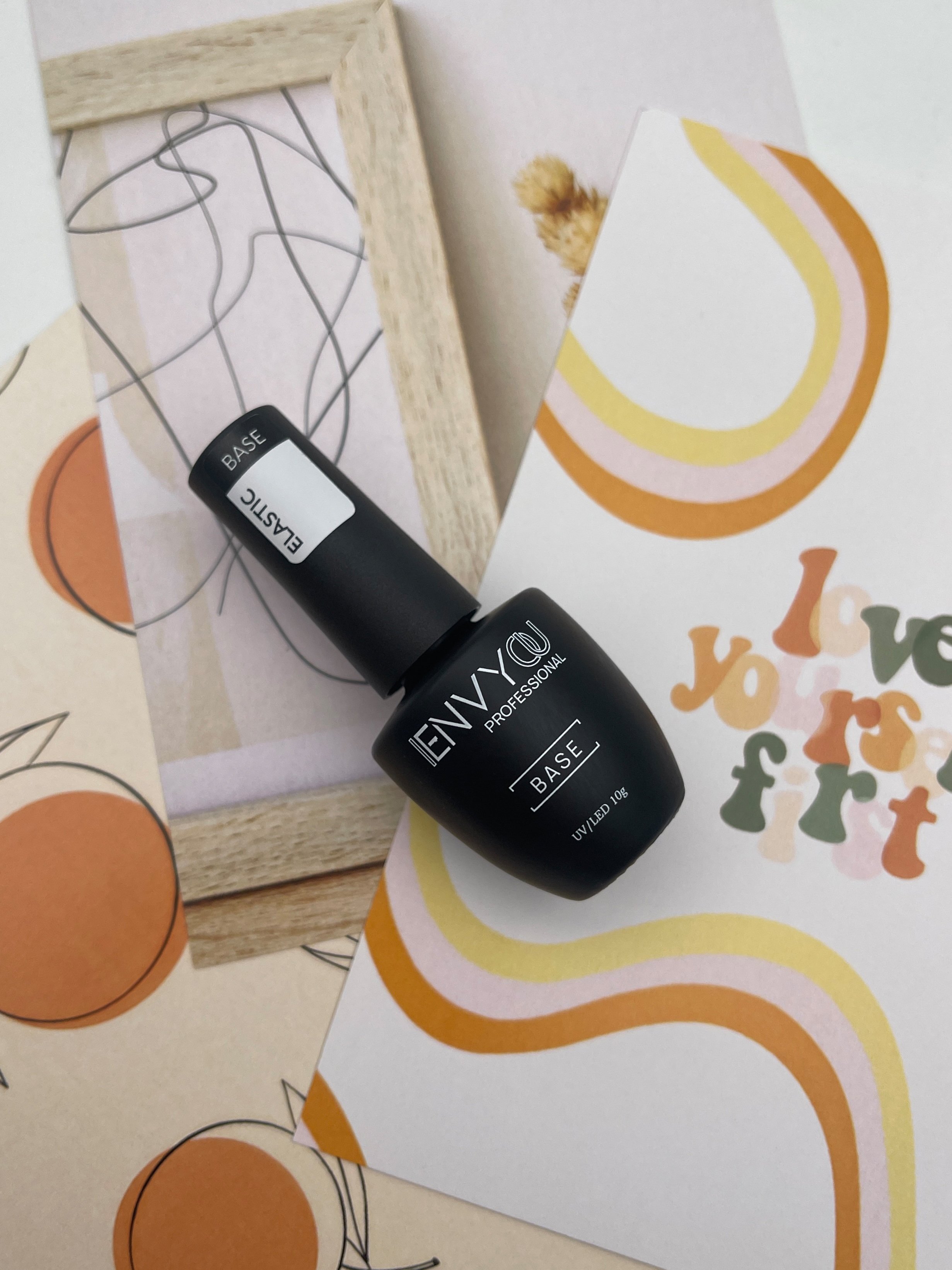 Это пластичная база ENVY, которая отлично подойдёт для нормальных и подвижных ногтей, а также ее можно использовать в качестве подложки под жёсткие материалы.